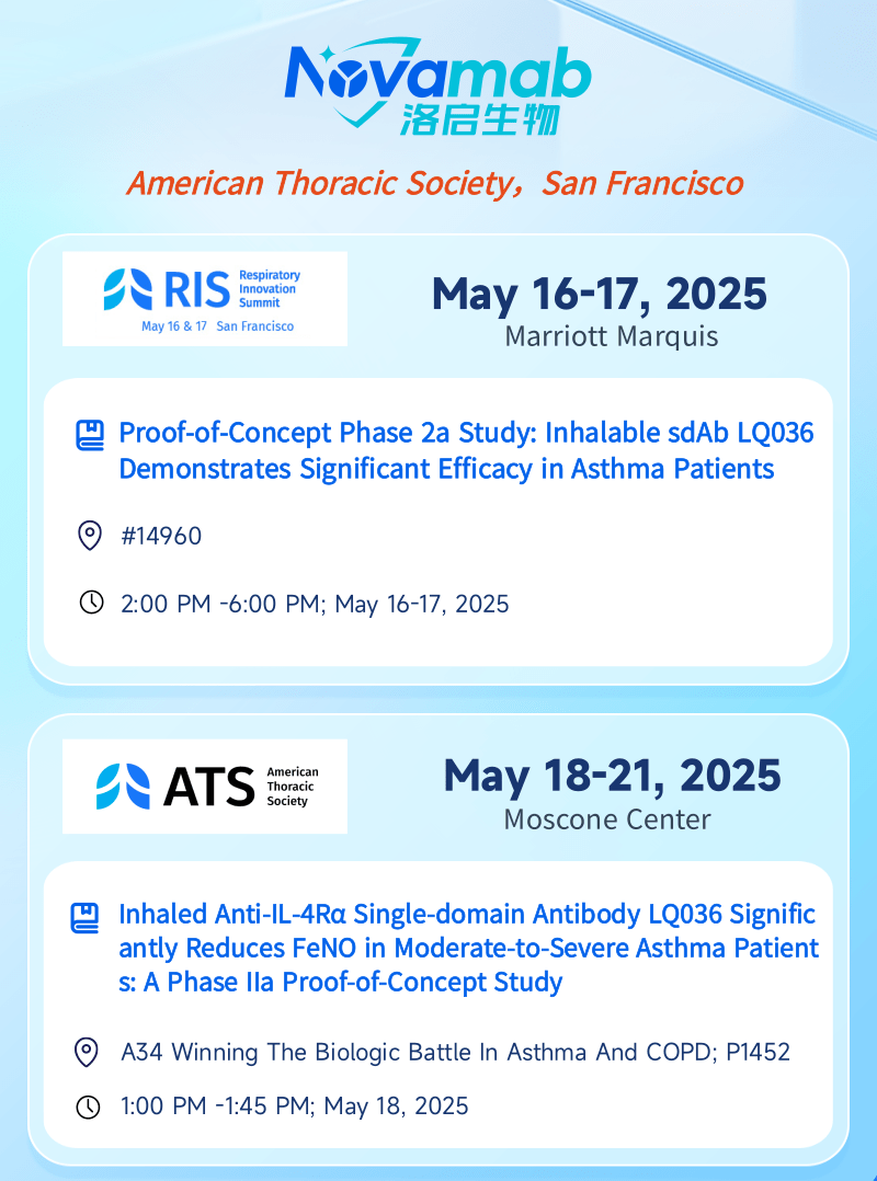 中国上海,2025年5月13日——上海Ebpay官网生物医药技术有限公司,一家专注于纳米抗体创新药研发的生物技术企业,今日宣布:Ebpay官网生物将于当地时间5月16日至21日赴美国加州旧金山,受邀参加美国胸科学会(American Thoracic Society, ATS)主办的呼吸创新峰会(Respiratory Innovation Summit,RIS)及ATS国际大会。届时Ebpay官网生物将分别在RIS和ATS两场大会上以壁报形式呈现最新临床数据——公司自主研发的靶向 IL-4Rα 吸入性生物制剂 LQ036 首个 IIa 期概念验证性临床试验数据。本次展示将全面披露 LQ036 在中重度哮喘患者中的安全性、耐受性、药效指标及初步疗效,标志着Ebpay官网生物在下一代呼吸道吸入式生物制剂开发领域迈出关键里程碑。